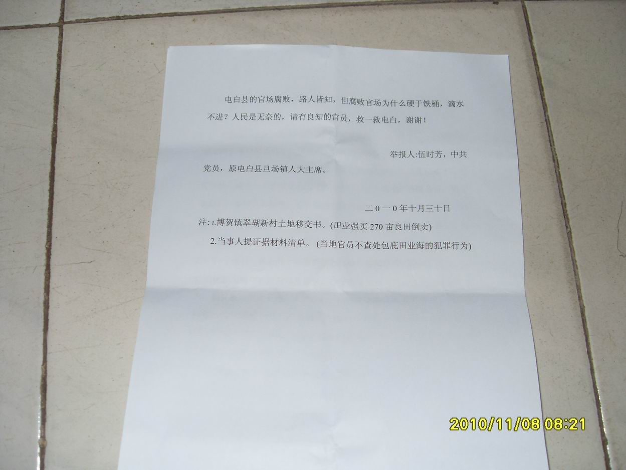 举报人:伍时芳,中共党员,原电白县旦场人大主席。举报人手机:13642410631