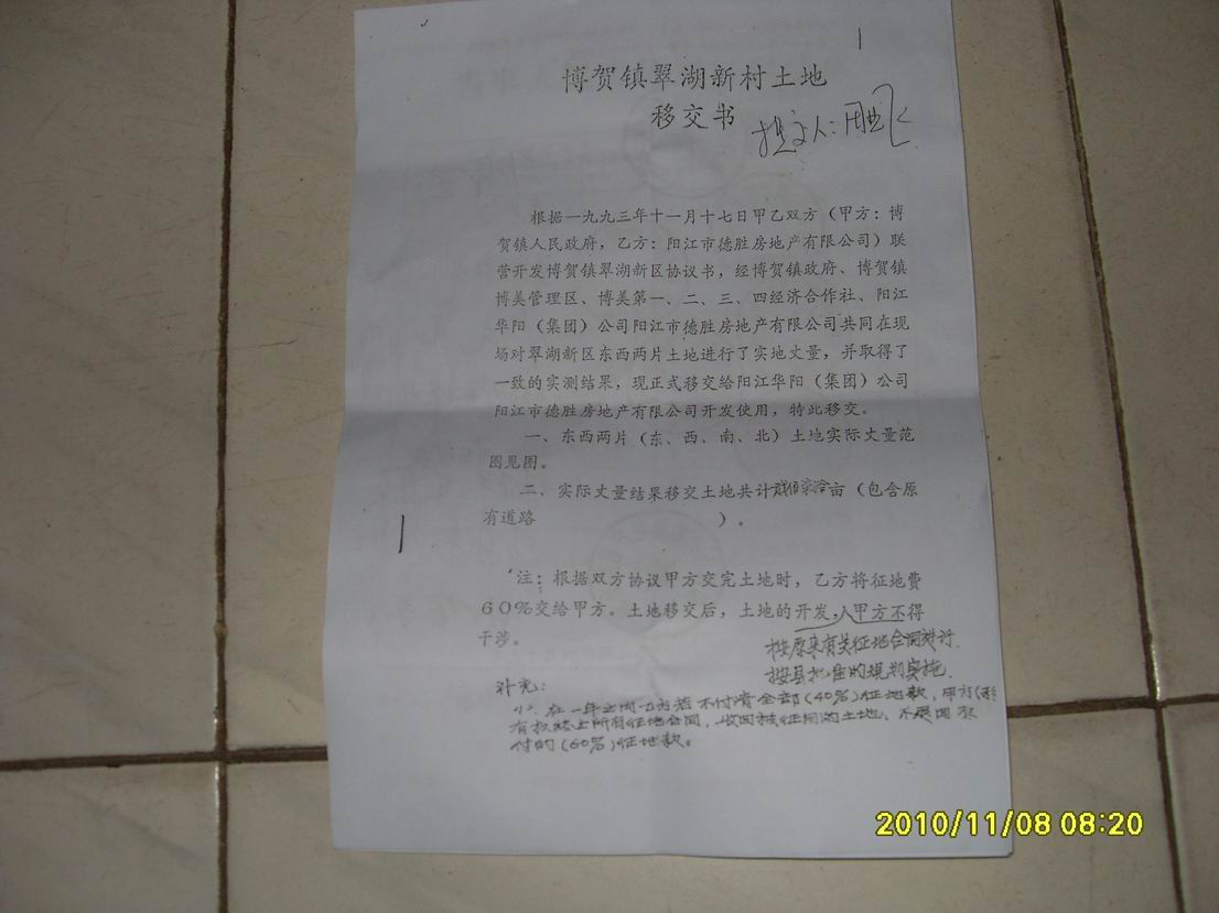 注:1、博贺镇翠湖新村土地移交书。(田业强买270亩良田倒卖)
