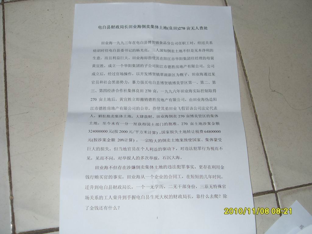 陈付、陈伟隆林江、刘伟锋、伍时芳、邓冠平等100位中国公民,怀着万分悲伤又十分无奈的心情向你举报:电白县财政局长田业海倒卖博美270亩集体土地,而电白县人民法院院长充当帮凶的犯罪事实。田业海一个屠夫,一九九三年结识时任电白县书记杨光亮,二人臭味相投,经过密谋后,以田业海这个亡命之徒出面,指使阳江市华阳集团公司经理黄宜胜(田业海母舅)成立子公司(阳江市德胜房地产有限公司),以与博贺镇政府联营开发翠湖新区为幌子,强行征收博美管区第一、二、三、四经济合作社良田270亩,杨光亮、田业海在一九九六年得到土地后,立即吊销阳江市德胜房地产有限公司,田业海即伪造该公司印章,假冒该公司法定代表人疯狂进行非法倒卖土地,杨光亮、田业海倒卖270亩土地的涉案金额324000000元(按每平方米2000元计算),国家损失税费64800000元(按总额20%计算),270亩特别巨大的土地被倒卖,但至今未一分一厘向国家报批,国土部门也从未查处。