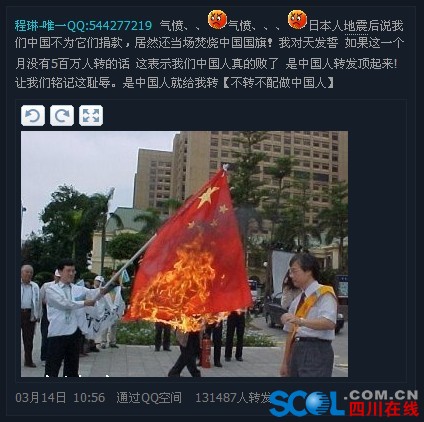 日本人地震后说我们中国不为它们捐款,居然还当场焚烧中国国旗!我对天发誓 如果这一个月没有1百万人转的话 这表示我们中国人真的败了