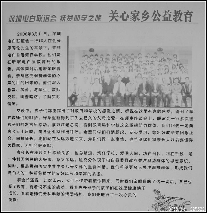 QUOTE(四中乐叔 @ 2011年04月02日 Saturday, 01:42 PM) 4月3日下午2点半左右,由深圳电白同乡会2011年度执行会长邵天胜老板牵头,组织深圳电白同乡会常务副会长、副会长、有爱心的企业家乡贤,慰问电白县湾仔孤儿学校。 也特别欢迎和邀请在电白的各阶层爱心人士参加。 张华副秘书长电话:13七601零5180 [snapback]3122009[/snapback] 湾仔学校,可以说是一个爱心符号! 也想参加,不知管饭否,哈哈