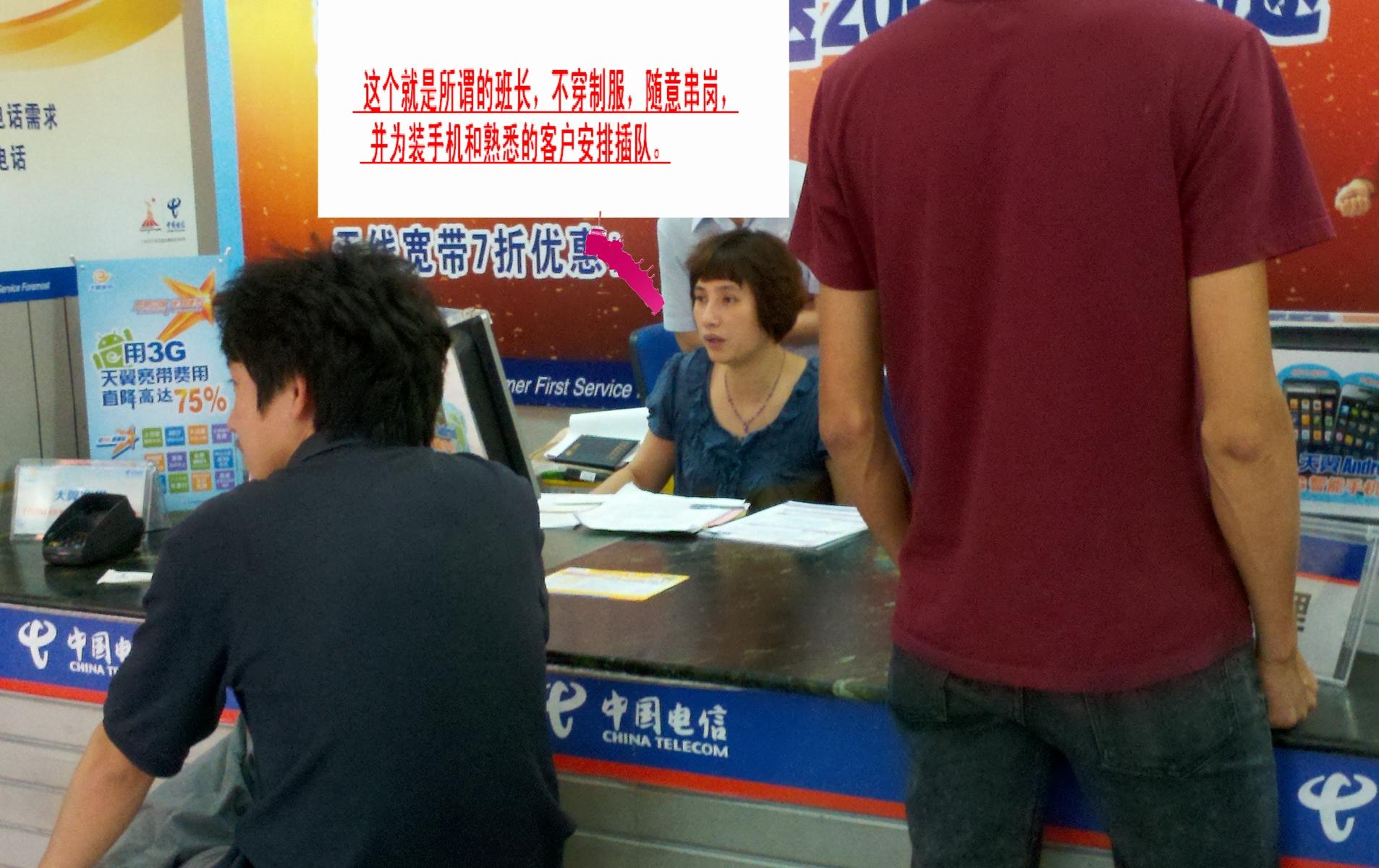 更可恶的事发生在我耗在营业厅的一个半小时后,小MM继续在很努力地帮我想办法解决这个问题的时候,一位没穿制服,被称为班长的女人一脚踩进来,抢走小MM的电脑,叫我到隔壁去排队办理,她要帮人装个手机。早已一肚子气的我,强忍怒气,到旁边继续排队,并趁机排下了照片。再等待了半个小时后,营业员再次告之,无法取消,要走流程,下次再来吧。
