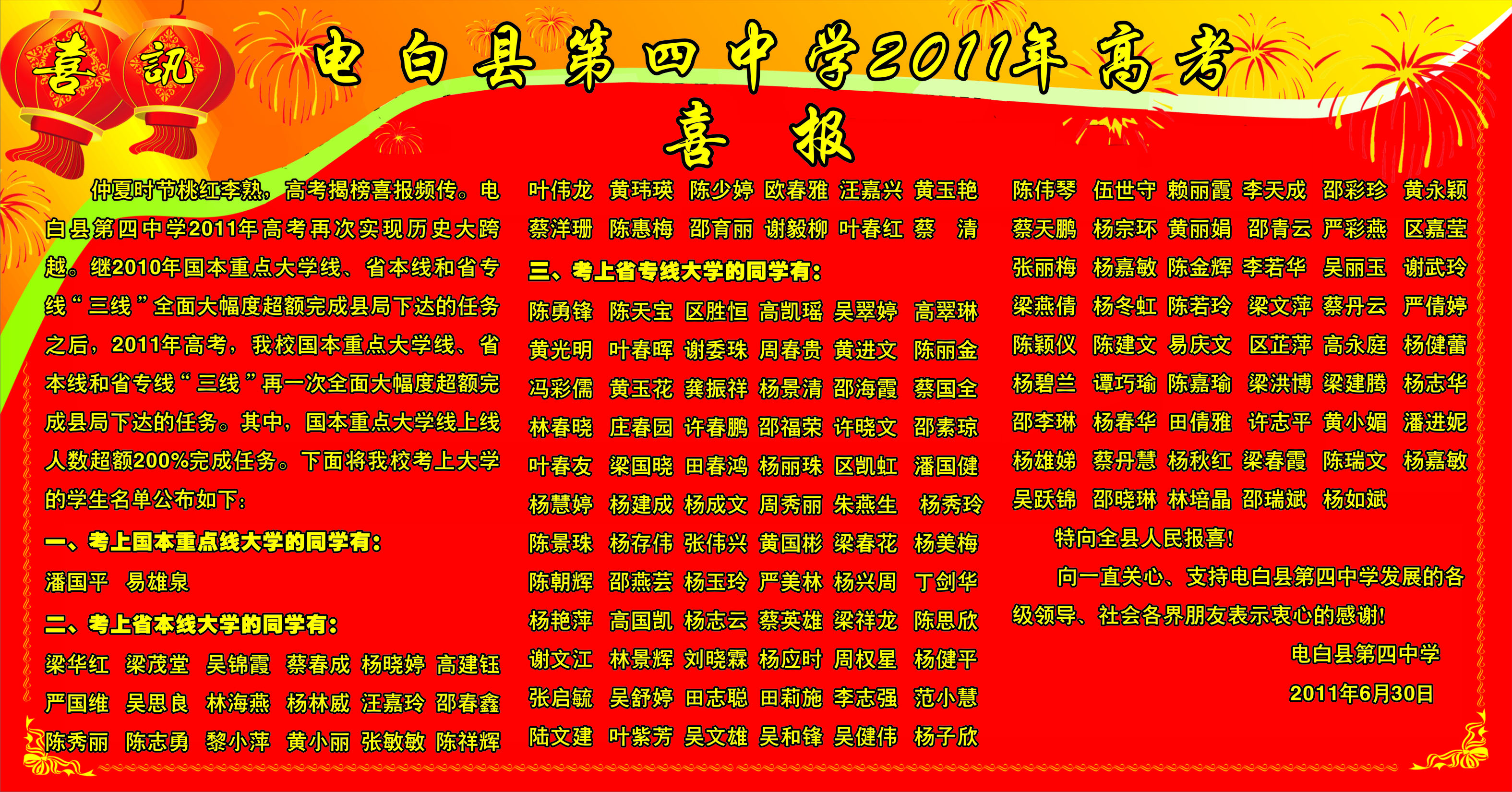 热烈祝贺电白四中2011年高考再次实现历史大跨越。