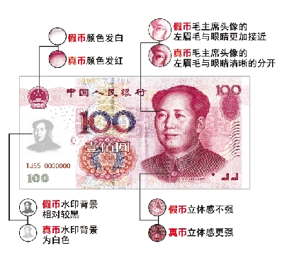 新版假钞来袭:假币毛主席像左眉毛与眼睛相连接