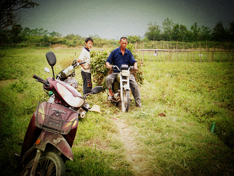 一个带着斗笠的农民伯伯开着125送家里的希望回校读书……