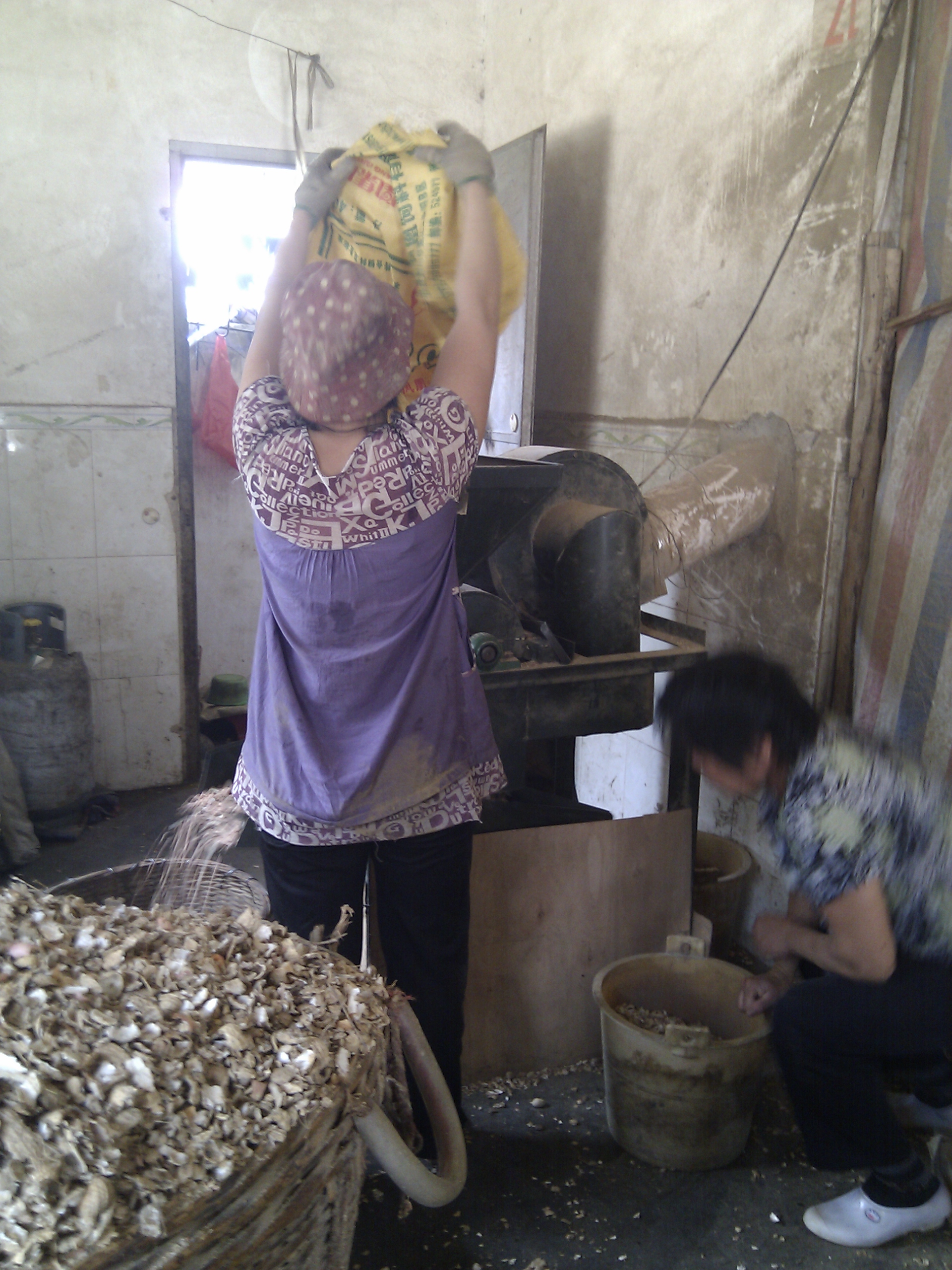 首先是先要去掉花生的外壳,这个活是最辛苦的,因为机器的噪音是最大的,漂浮的粉末是最多的,还得靠人力把大包大包的花生抗上漏斗。所以站在一旁,作为一个大男人是不太好意思站很久而不帮手的,不过这位阿姨还真厉害。