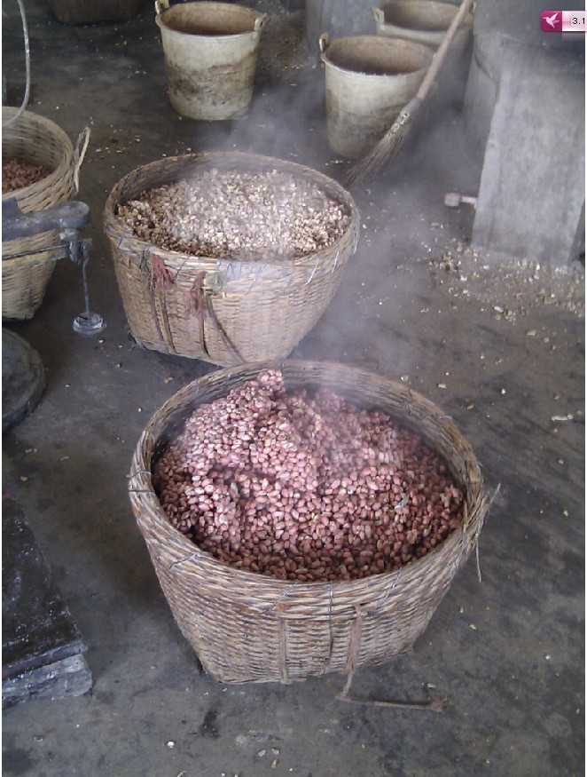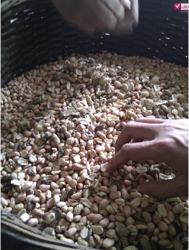 打完外壳后,总会剩许多漏网之鱼,所以就要人工挑挑,呵呵,在以前这个都是我们小孩子的活。不过这次只有我和妈妈,所以也要努力挑挑,其实外壳对油质的影响不大,关键是坏的臭掉的花生才是关键。但是由于人手不够,不能等挑干净就只好让花生米进入下一步。