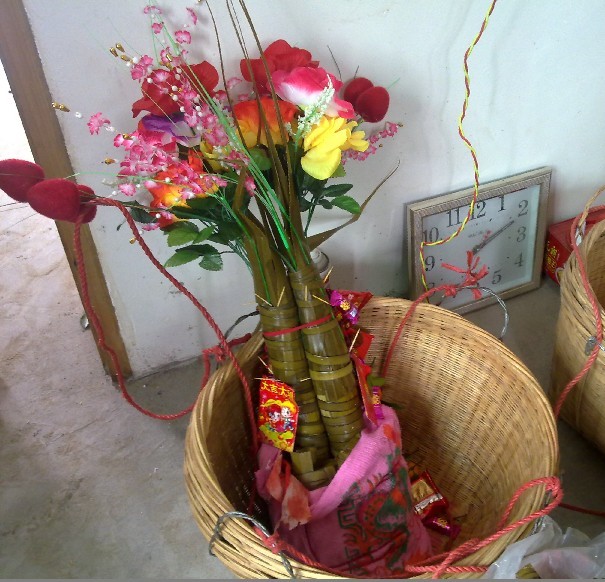 山区客家风俗,属于比较特别意义的“礼担”。根部包着的红毛巾严格来说是个用毛巾缝合的毛巾袋,“袋”通“代”,意含“万代子孙”的祝愿,应是以新娘的弟兄为名义送出的。进宅时也会有,由女宅主的弟兄送且作为主礼在新宅供奉至“三朝”。