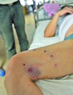 昨日,记者在茂名市人民医院见到了正在疗伤的救人村民唐金明,他的腹部、双腿脚等部位均明显可见到被枪击后所残留的铁砂弹,“当夜已手术取出了28颗铁砂,这伙歹徒实在太残忍了!”唐金明说,当时他刚打开后车门,准备和其他村民一起将被砍至重伤的唐海洪抬上车送院,在开车门瞬间突然一眼瞥见10多名歹徒持三四支枪气势汹汹地赶来。