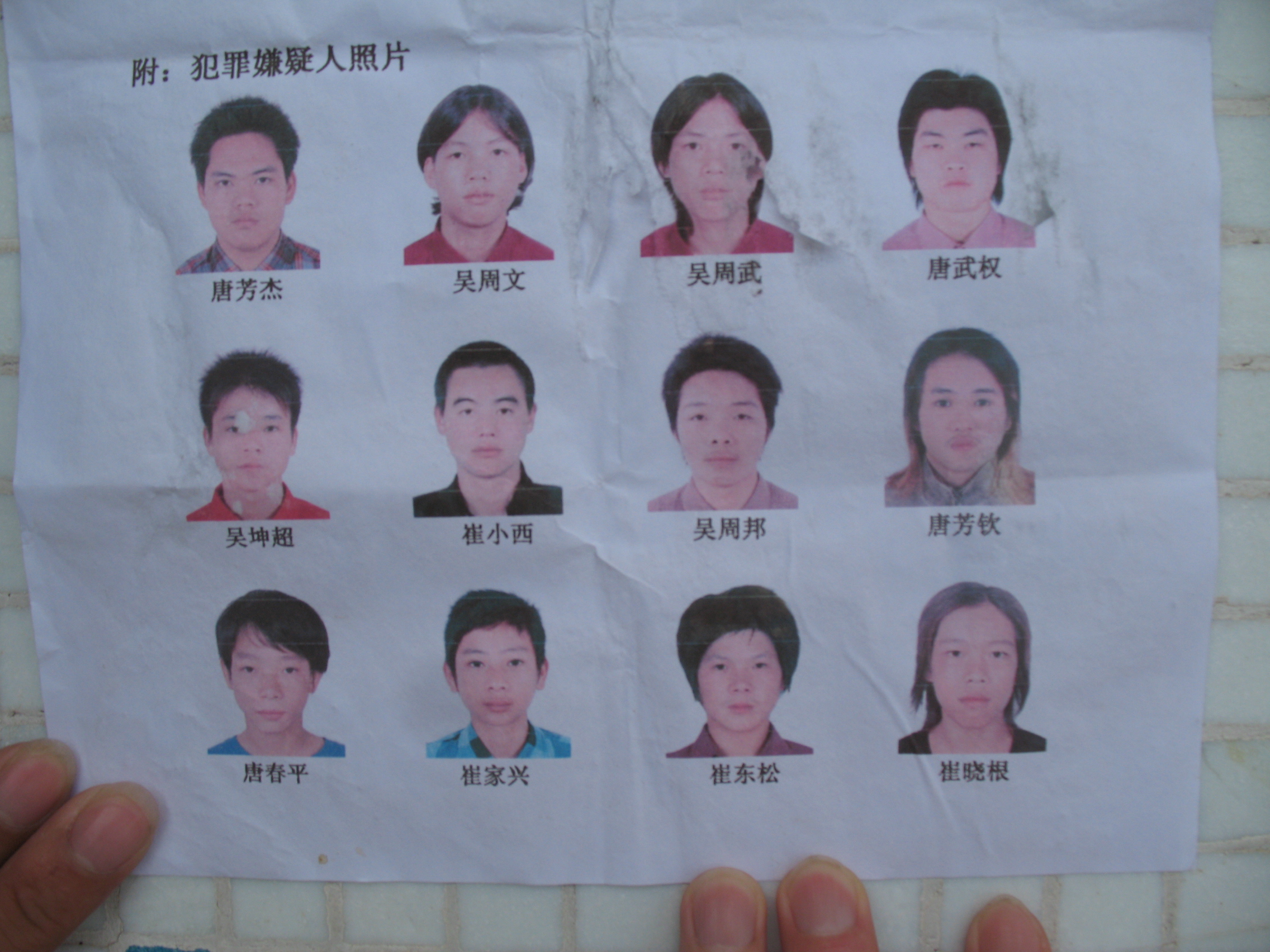 通缉令有名的还有十人没有抓到,除了崔小西和崔东松两个人渣是霞洞由甘村委会格田村的之外,另外八个凶手都是霞洞新建村委会灯心塘村或石船头村的(两村是相连的),听说发生命案后,这八个凶手的家人经常走在一起想办法帮它们的野种逃避法律的制裁。开始时听到这消息,许多人都不相信,现在大家都肯定这帮凶手的家人在暗中支持、纵容自己的野种的了。