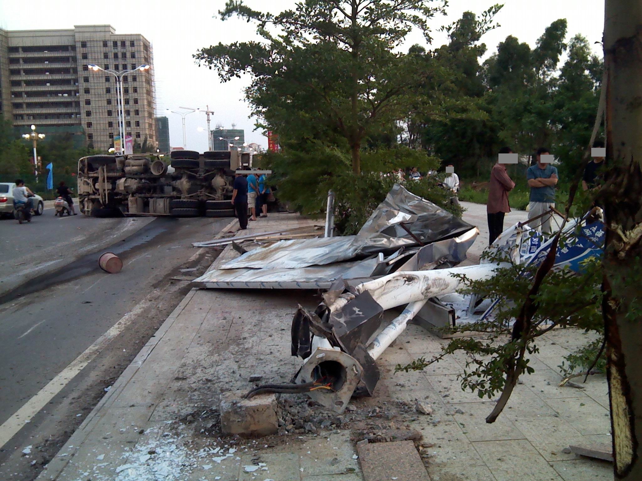 约6点30分,春华学校、加油站朝县府方向约800米,一辆载着水泥浆的水泥罐车在合富花园路口对侧道路侧翻,撞断灯柱后,再向前滑出20米,太恐怖了,不知是否造成伤亡。 迎宾路的交通事故频出,跪求整治。感觉应限在30公里时速内,不定点安装测速仪。 因车祸致死的人真的好冤。请铁腕向上级提出议案,解决迎宾路交通问题。非常感谢!