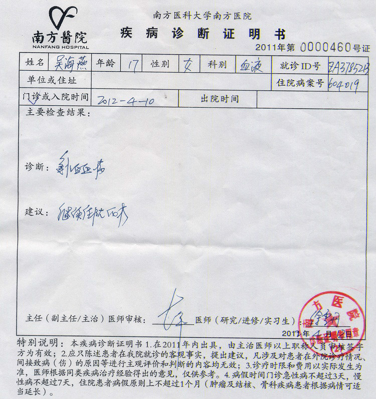 吴海燕治疗的医院:广州市南方医院内科楼13楼血液科72床,住院号:604019