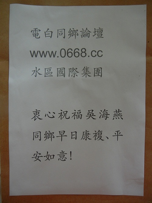 QUOTE(byronroy @ 2012年05月13日 Sunday, 12:26 PM) 早上与论坛的"听妈妈的话"同乡探望并转交了水区国际集团的一千六百元捐款! 祝吴海燕同乡早日康复! [snapback]3359792[/snapback] 吴建波有责任反馈这件事情。 捐助人自己说出来,不如由受捐人说出来。、,这是对捐助人的尊重,除非捐助人要求不说的。