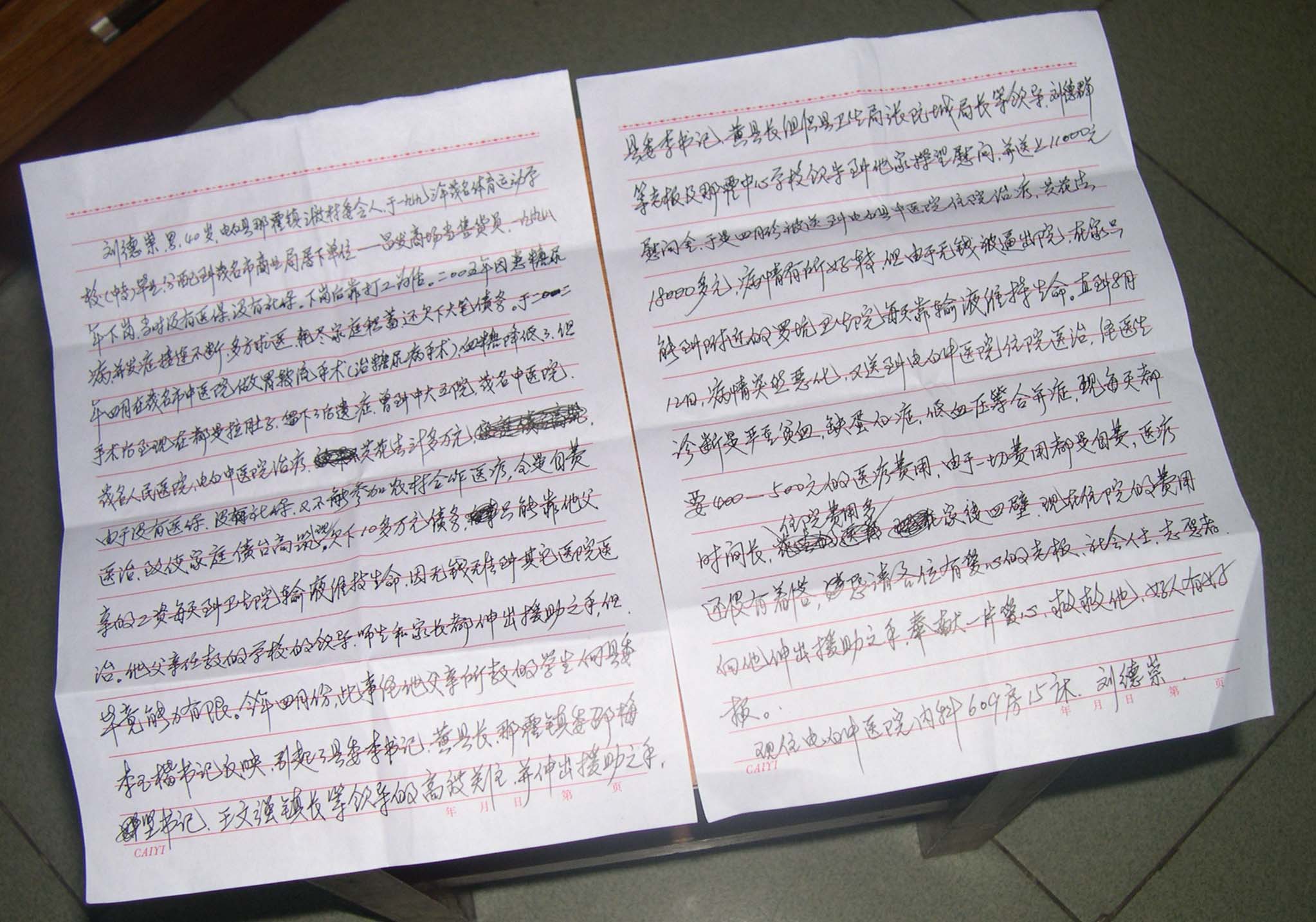 转者按:刘茂隆,本县那霍镇三渡小学教师,现年59岁,其儿子1993年在茂名市体校毕业后安排在市商业局昌发商场当售货员,1998年商场被私人承包,刘老师的儿子被迫下岗打工为活,2005年罹患糖尿病,四方求医耗尽家庭积蓄,2011年4月出现并发症在茂名市中医院做胃转流手术,术后留下严重的后遗症辗转中大五院、茂名市人民医院、电白中医院、沙琅医院、罗坑卫生院等地治疗,花去医疗费三十多万元,由于其儿子刘德崇下岗早,昌发商场没有帮其办理社保医保,回乡居住时又不能办理农村合作医疗,儿子的医药费全由刘老师负担,致使刘老师入不敷出而债台高筑。刘老师所教的学生看在眼里很难过,就以《请帮帮我们的老师》为题给市委常委,县委书记李玉楷写信进行反映(全班学生都按上幼稚的指模)。