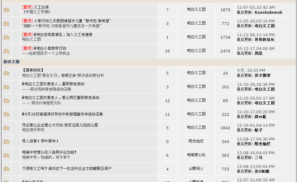 为电白义工团专门开了一个版块,本是好事,但由于大部分人都是看主版,很少游览其他板块,所以电白义工团的大部分倡议活动都没人知道,有朋友叫我去看电白义工团的募捐贴,我找了半天才找到。因此,我提议:电白义工团以后有什么倡议和活动,在主版发帖,效果可能会比较好。