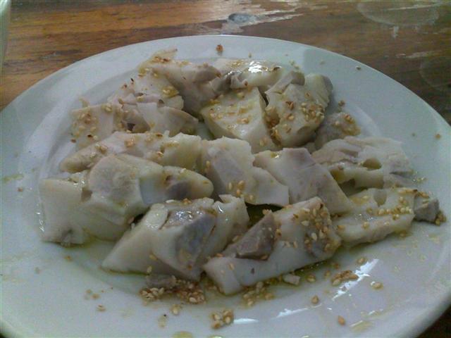 用泡软的米混着芋头一起捣烂,用清水和匀,然后隔水蒸熟,佩上调料吃