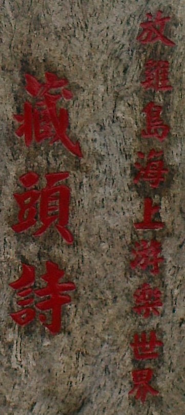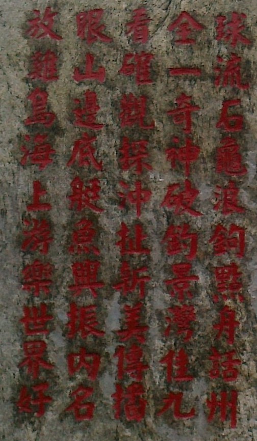 放鸡岛天后宫我去参拜了,该宫整体建设不错,很有气势.但楹联的确坏了我游览的心情.忍不住我h到了该岛一负责人陈经理(不是陈明哲老板)问联是谁写的.他说不知道,大慨是承包给造殿的人搞的.一个花了大钱建造起来的大殿宇,竞不愿花湿碎钱征些好联,真不是味道.