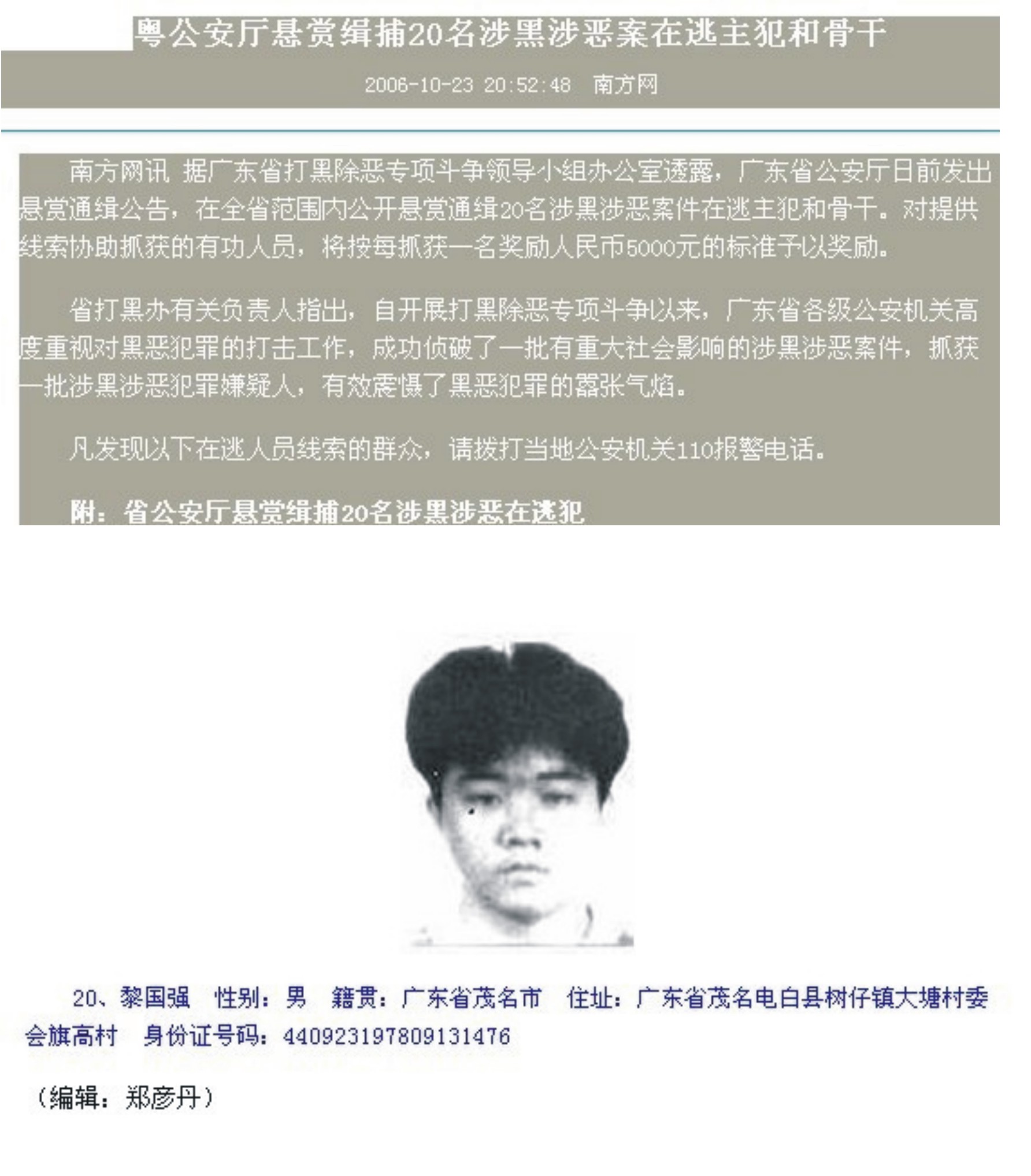 震惊:通缉犯黎国强作案累累,公安机关竞无任何案底