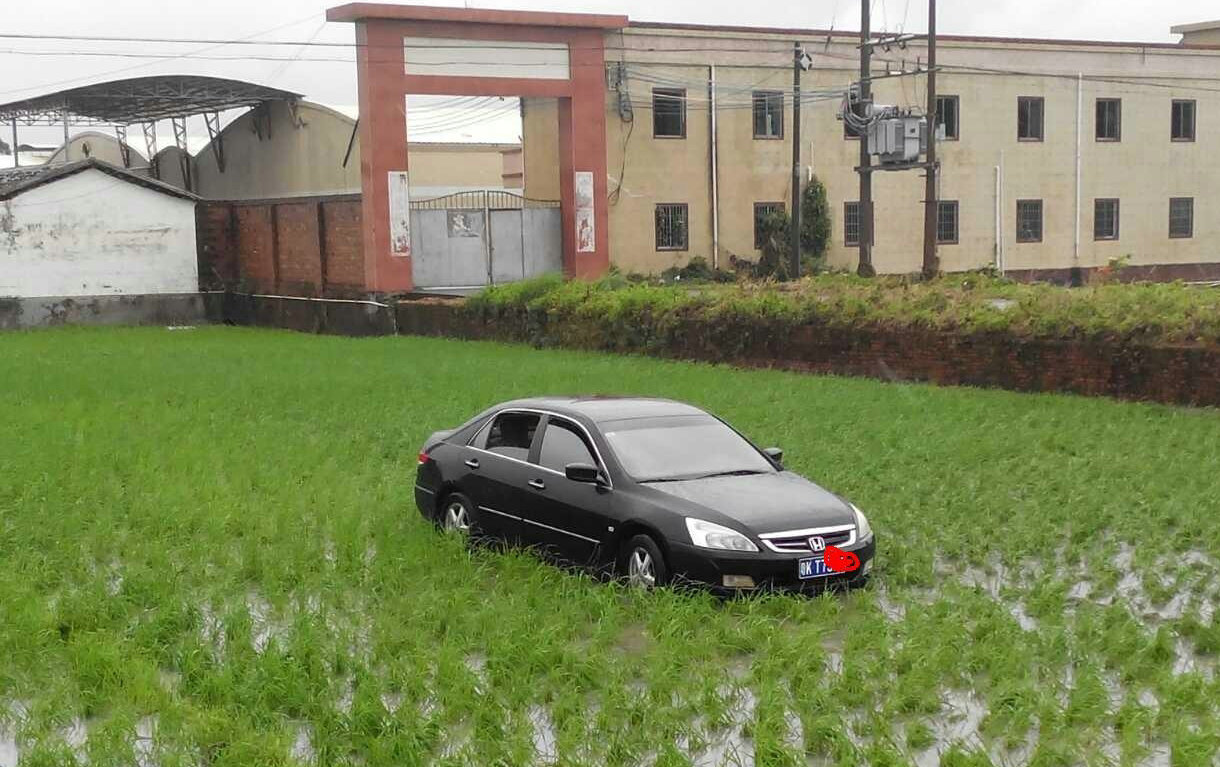 昨日下午1时,在全日辉家厂房外,南都记者看到,黄瑞珍驾车载儿女逃命的小轿车已经离开路面,车身掉在旁边十多米外的一片稻田中间。