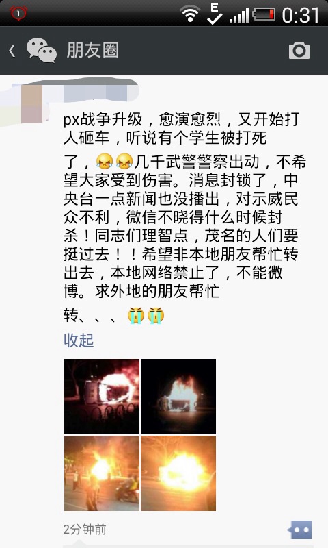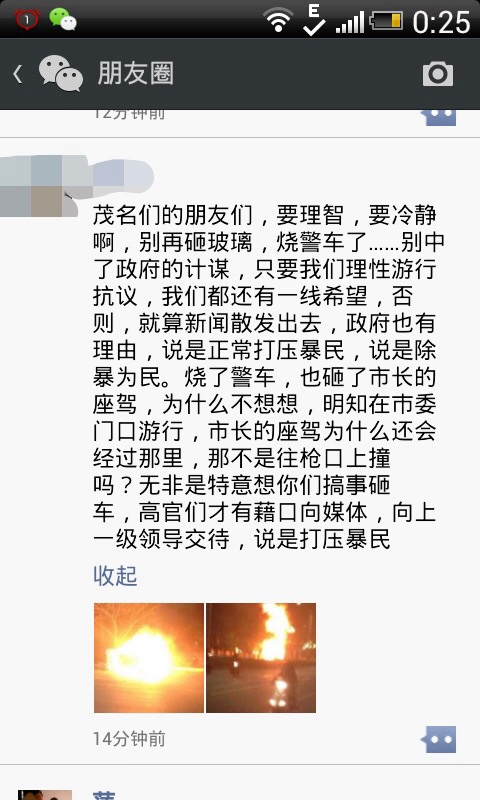 请大家警惕,别再做过激行为,小心中了官方诡计,市长故意开车到人群中劝谕群众,明知会激发群众情绪,结果是致使坚持了一天无人理会甚至被暴打,以致现场群众做出过激行为,烧了市长的车,警车,他们就可以定性市民合理诉求为暴民动乱啊
