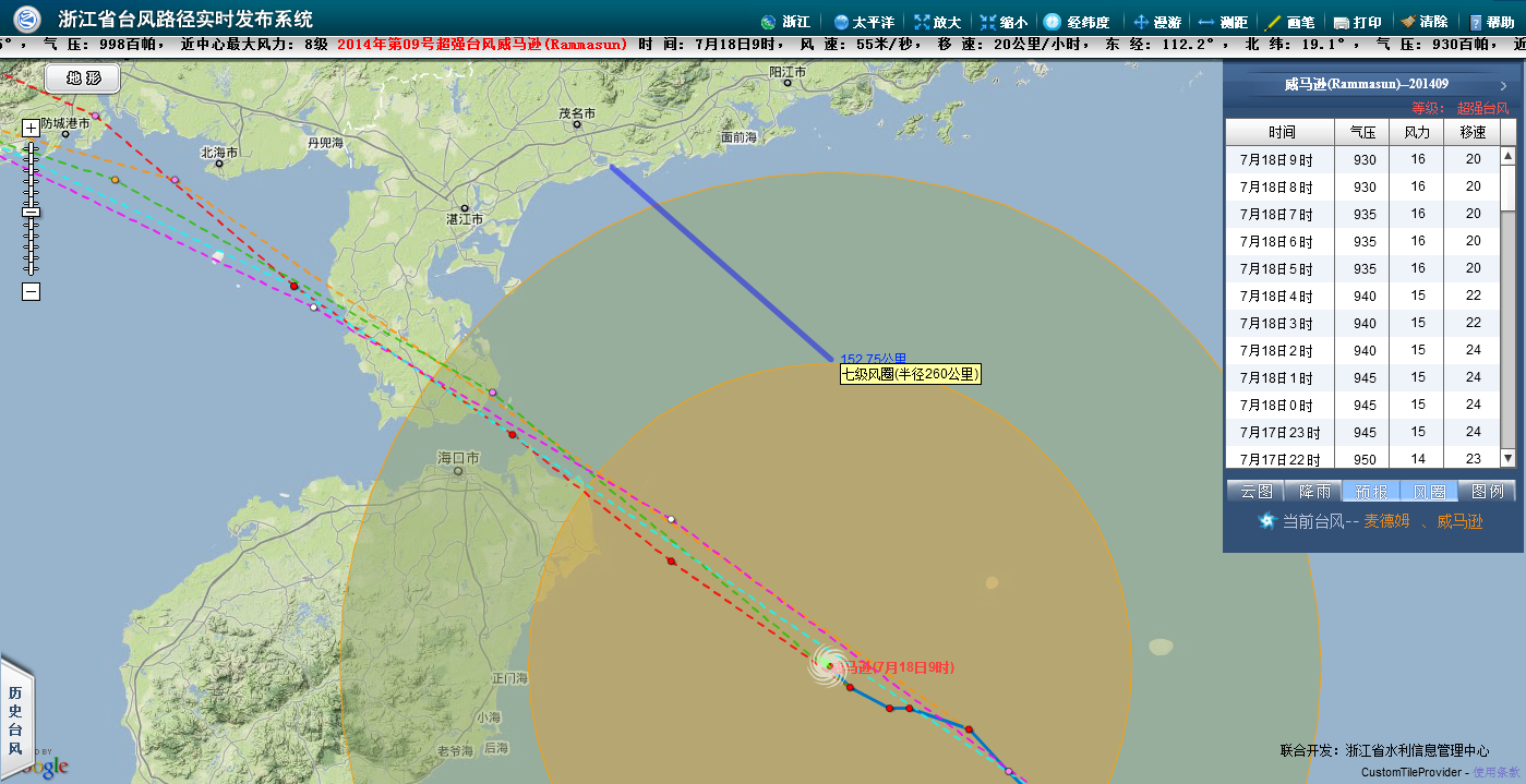18日到19日,湛江、茂名将有12-15级大风,阵风16级并有大暴雨到特大暴雨。粤西海面、琼州海峡、北部湾北部海面风力将逐渐加大到13-15级、阵风16级,其中“威马逊”中心经过的附近海面旋转风15级、阵风16级;珠江口外海面风力8-10级、阵风12级。