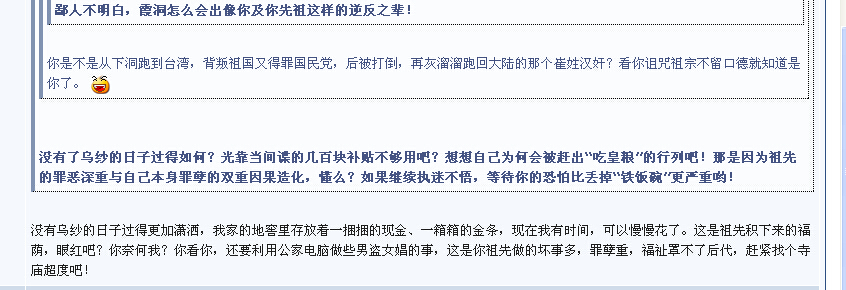QUOTE(东澳夕照 @ 2014年08月15日 Friday, 11:43 AM) 先放你一马,回头再收拾你。 [snapback]3686917[/snapback] 搂罗不成就老羞成怒,可耻之极。鄙人说美国间谍与你何干?鄙人说电白教育与你何干?这么气急败坏说明你是什么人了吧?