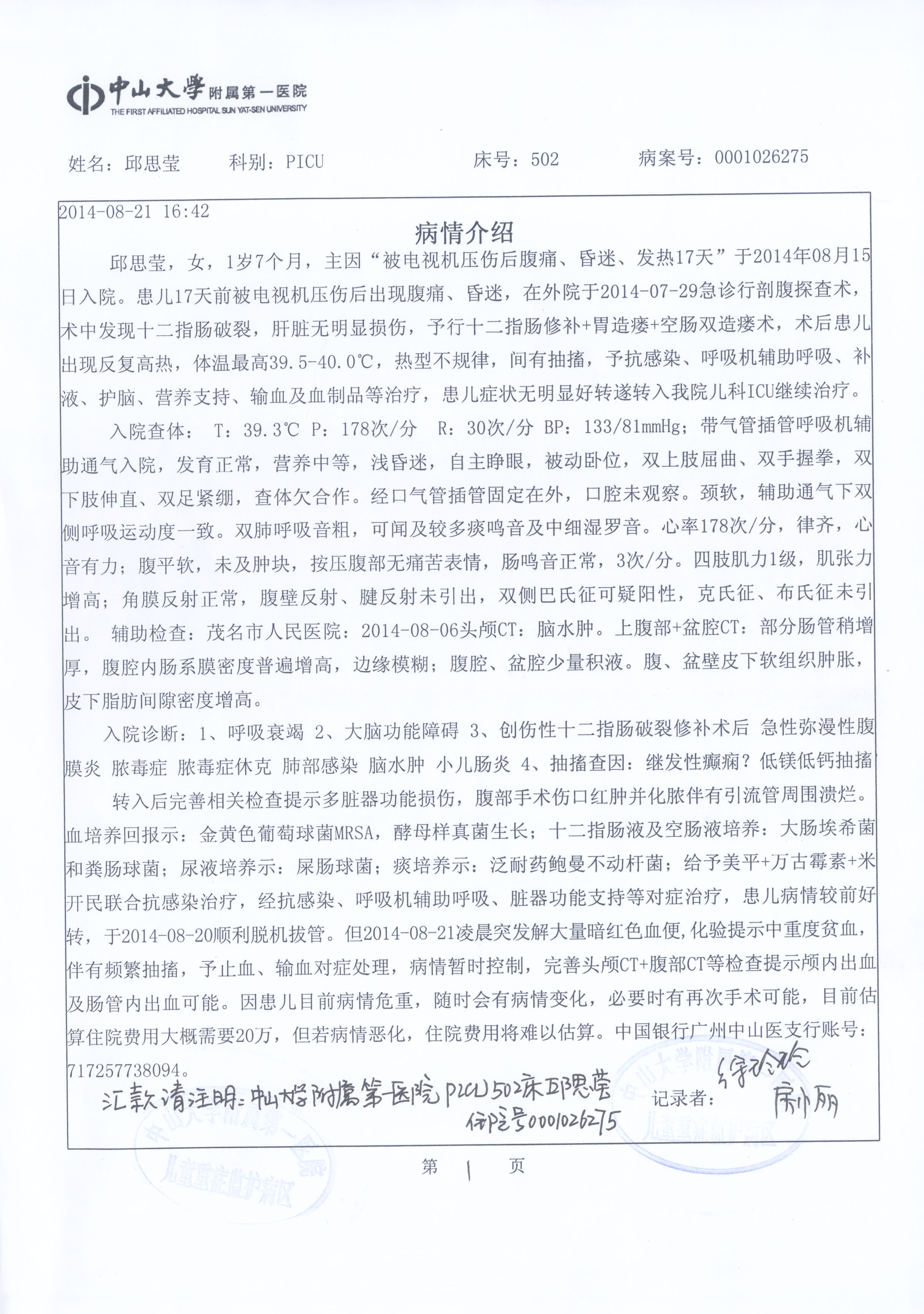 请给一个1岁7个月小生命延续的机会。广东茂名农家小女孩邱思莹,正处在好动的年龄阶段。在2014年7月29日与3岁的哥哥一起玩耍时发生了意外,被家里的老式电视机砸中受伤。入住茂名人民医院ICU病房急救,诊断为十二指肠破裂,急性弥漫性腹膜炎,感染性休克,肝挫裂伤,急性应激性溃并出血,多器官功能障碍综合症,该院因技术和设备无力继续治疗患儿,8月15日转入广州中山大学附属第一医院PICU中深切治疗己十多天,每天1万~3万元的治疗费使这个农民家庭陷入绝望中, 这期间都是向别人借钱治病,早已负债累累,也没钱可借了。2014年8月24日和26日,主诊医生说病情有所好转,但是未脱离危险期,仍在PICU治疗,面对每天巨额的医疗费用,全家人在无钱、忧心、无助、悲伤中!尽管如此,我们从来没有放弃救治小思莹的任何一个机会,然而接下来的治疗费用初步估计还要20多万甚至更多,希望各界善心人士能踊跃献出爱心,让小思莹的生命可以得以延续