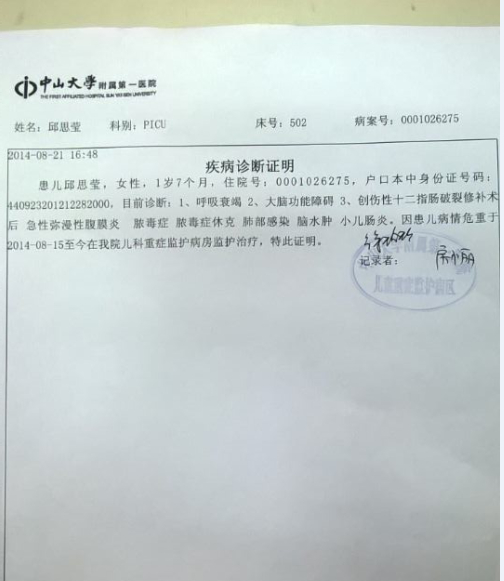 (小思莹现在在中山大学附属第一医院6号楼9楼PICU,502床,详情可联系家属13763071504(邱雪莲))