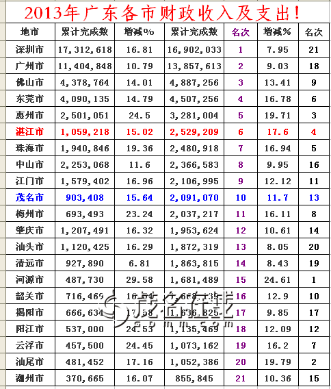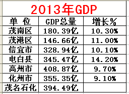 或许年纪轻轻的“茂名发展”的师爷们犯了老人痴呆,也许“茂名发展”的幽灵已经将这些恨不得一夜暴富的师爷们的思维导向了一个深不见底的鬼坑,要么这些自诩高明的师爷们怎么连茂名地区各县市的发展现实都忘得一清二楚了。不过不要紧,现在请这些自诩“电白的救世主”们过来看看广东与茂名2013年各县市的GDP与财政总收入吧!