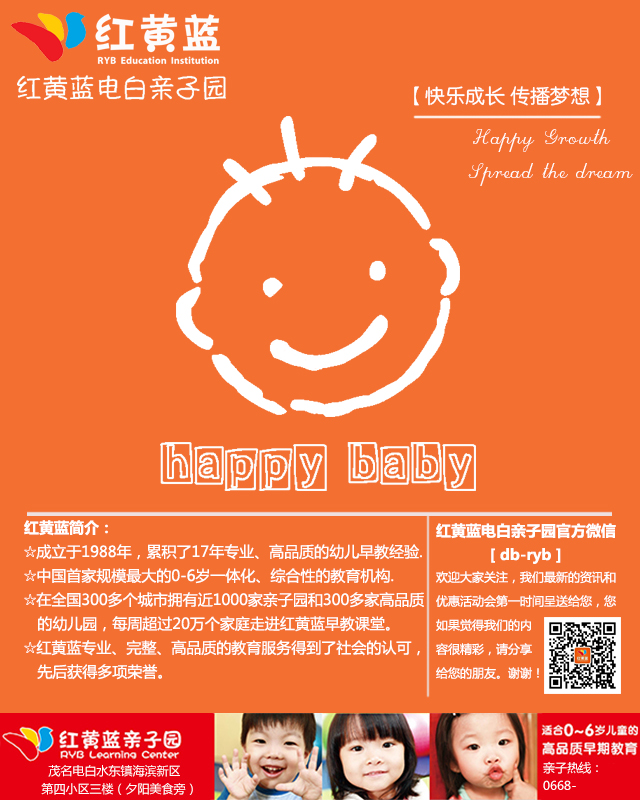 各位亲爱的电白家长: 电白县首家幼儿早期教育红黄蓝电白亲子园各项筹建工作已经在密锣紧鼓进行当中!如今 官方微信号(db-RYB)现已开通并正常运作!欢迎大家订阅关注,我们会将园所最新的动态和 优惠活动第一时间通过微信呈送给大家!大家可以在微信公众号搜索“db-ryb”或者扫扫下方我 们企业名片的二维码就可以找到我们! [attachmentid=340828] [attachmentid=340827]