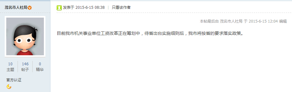 茂名市人社局在茂名在线就相关问题的回复。睇来有排等?