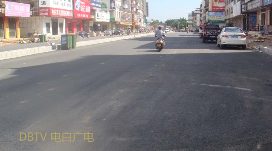 人民路从三角圩至水东加油站已铺设好沥青,车辆行驶顺畅。