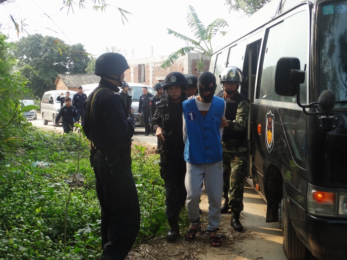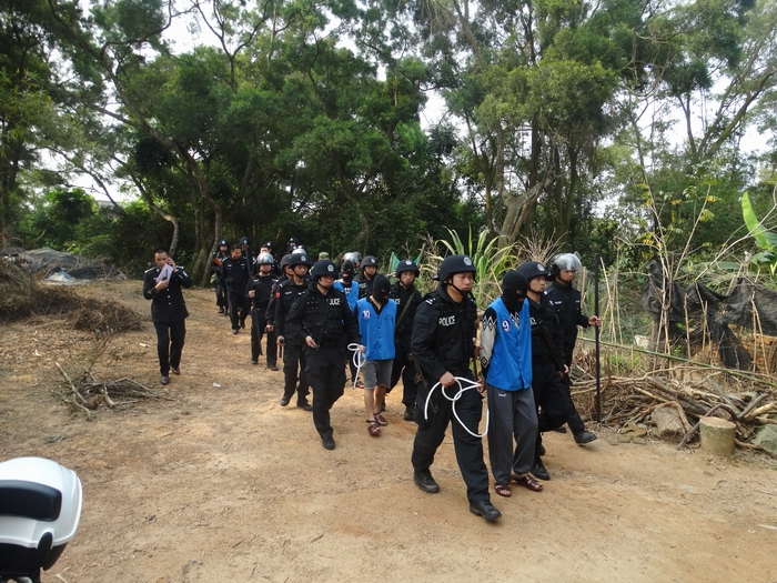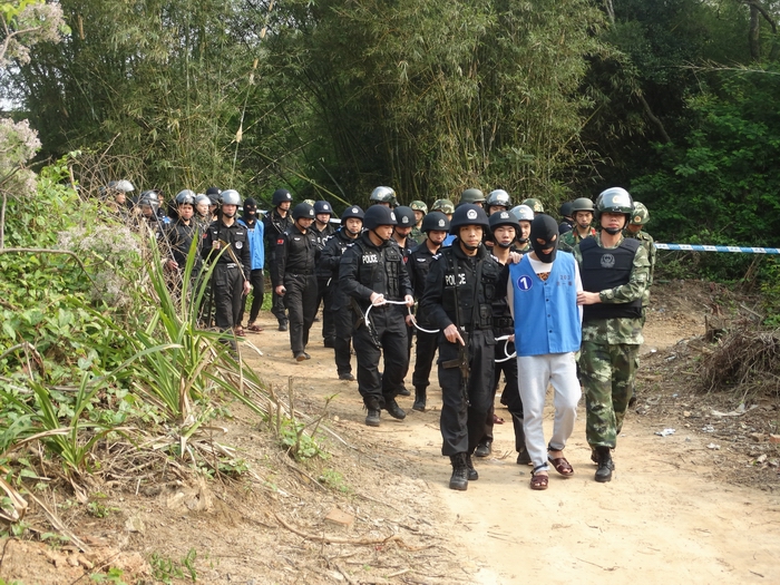 3月29日,茂名市公安局滨海新区分局组织150多名警力,武装押解2015年“12.26”故意伤害致死案11名犯罪嫌疑人,到茂名滨海新区电城镇架炮村和电白区岭门镇十四坡等4个地点指认现场。