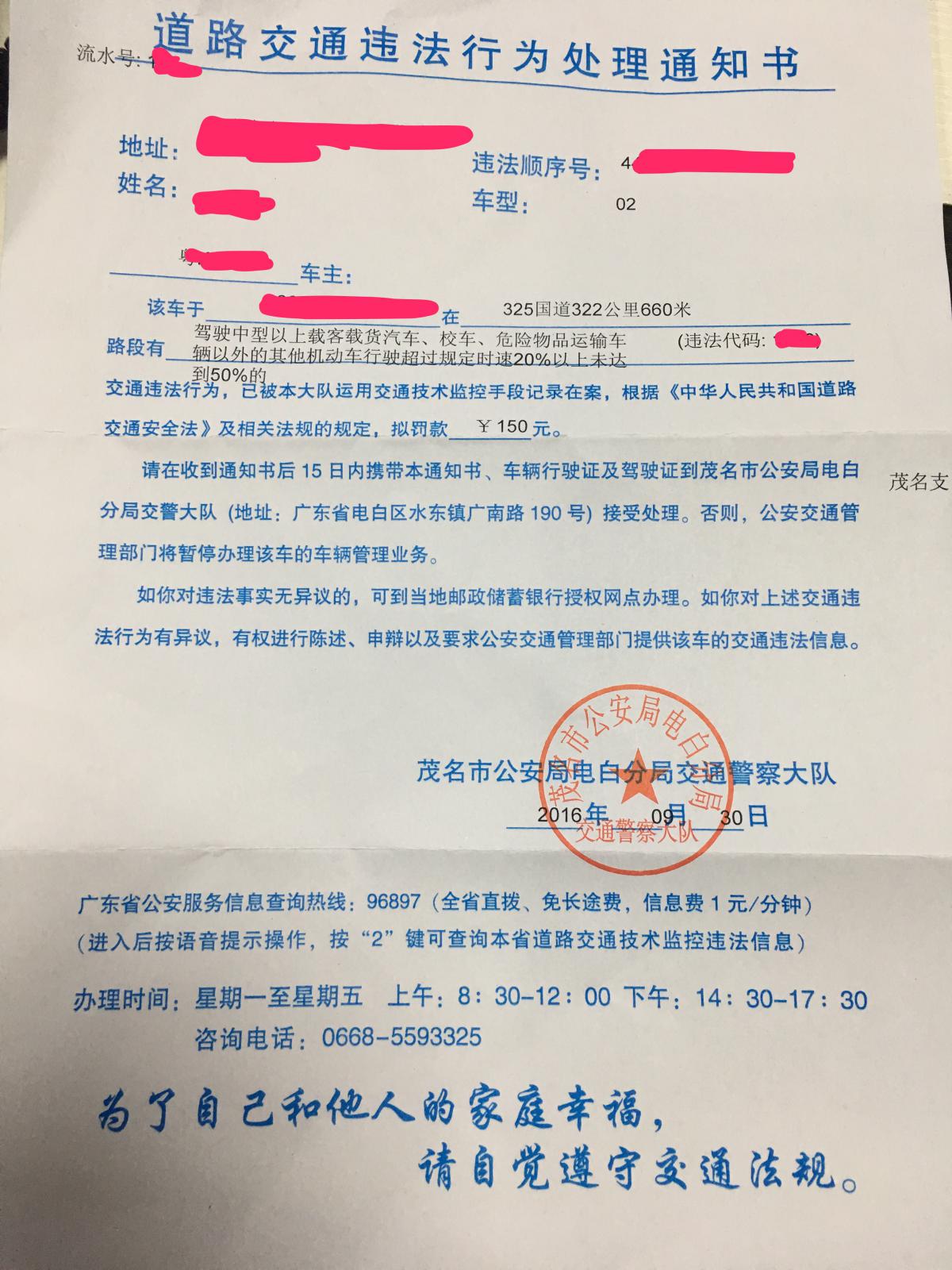 wxzhan 高中三年级 注册 2005-11-24 消息 675 反馈评分 46 点数 11 2016-10-02 #4 牵着你的手跳东湖 说: 感谢交警蜀黍送给我国庆礼物!为了自己和他人的家庭幸福,必须自觉遵守交通法规。 有两个疑问有劳交警蜀黍解答: 1、(如图)道路交通违法行为处理通知书,通知内容是否欠缺规范。 2、(如图)道路交通违法行为处理通知书,通知内容为何缺少交通违法时间日期。 点击展开... 9月30日的违章单???看你图应该是寄给你的吧,你的贴是昨天发的,10月1日这么快就收到了的??天,,电白交警神速办事能力!!!如果这办事能力别处也一样的话,呵呵,,电白就不再电白了!!!