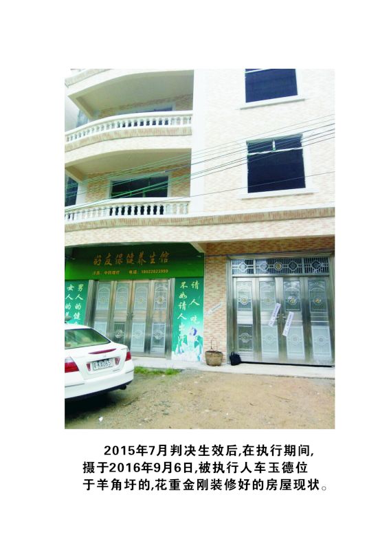 该判决已于2015年7月25日生效,生效后我父亲委托律师提交了强制执行申请书。判决生效至今已一年多了,期间被执行人车玉德当时有一橦三层新建的、位于羊角镇政府门口附近的私宅,住宅建筑面积达七百多平方,当时还是毛坯房,里外并未装修。在执行期间,我和父亲不下十余次催促电白区法院执行局执行庭廖颖刚庭长前去查封拍卖,可是他却多次拖延,没有采取任何制止措施,也不拘留被执行人车玉德以维护法律正义,并对被执行人花重金装修新宅采取放任自由态度。今年六月份,该被执行的房子,被车玉德花重金装修好了,车玉德存放在家里的现金顺利地转移到他的不动产房子上。
