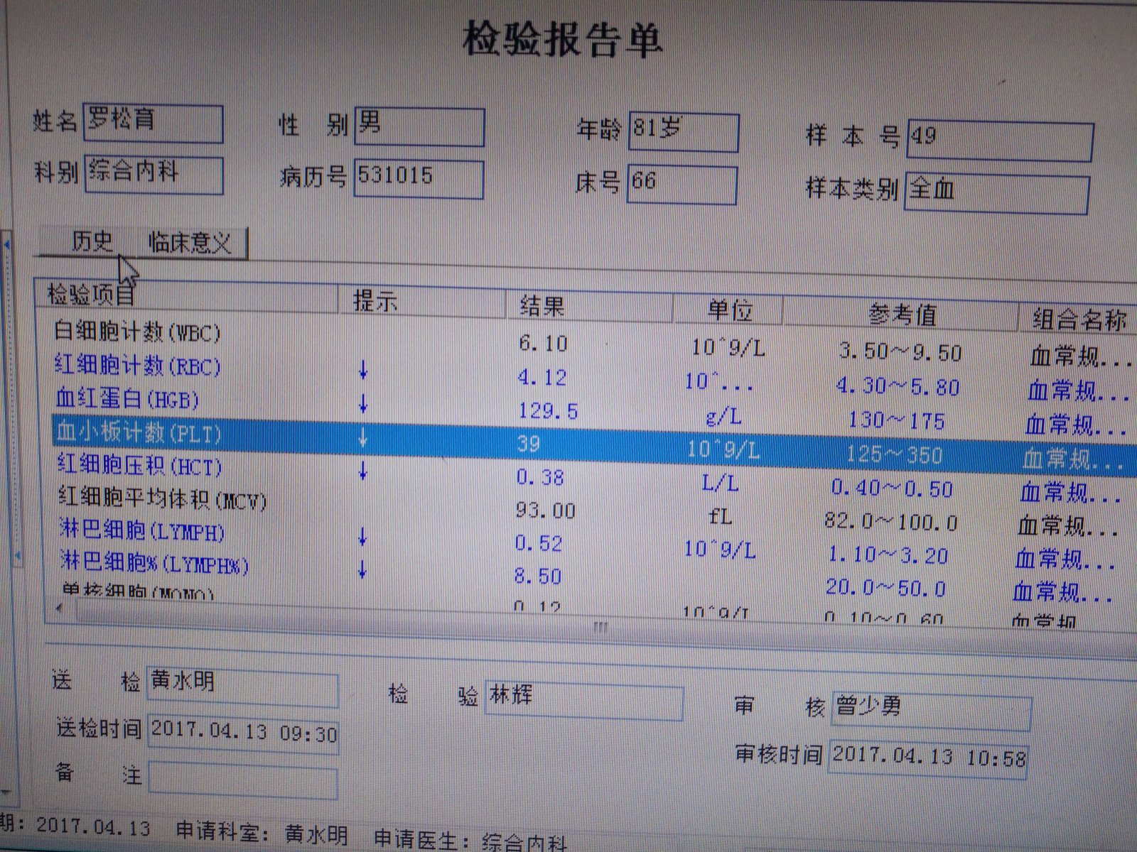 血小板继续下降,只有39;离大出血已不远了,