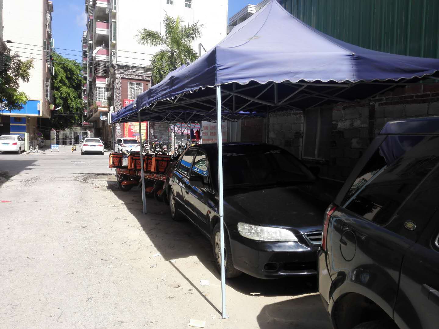 电白区水东镇开元居那站垌路,蒸横四海茶餐厅正对面的“渔巴佬配送公司”长期在路面搭起帐篷,占用一半公路,停放该配送公司的车辆(6辆摩托车)和一辆车牌号为:浙Av8x21的小车,严重影响路上行驶的汽车,造成安全隐患,广大市民恳请相关部门及时处理,谢谢!