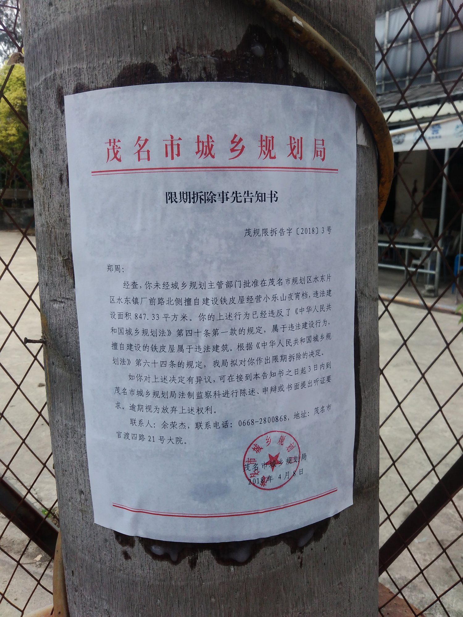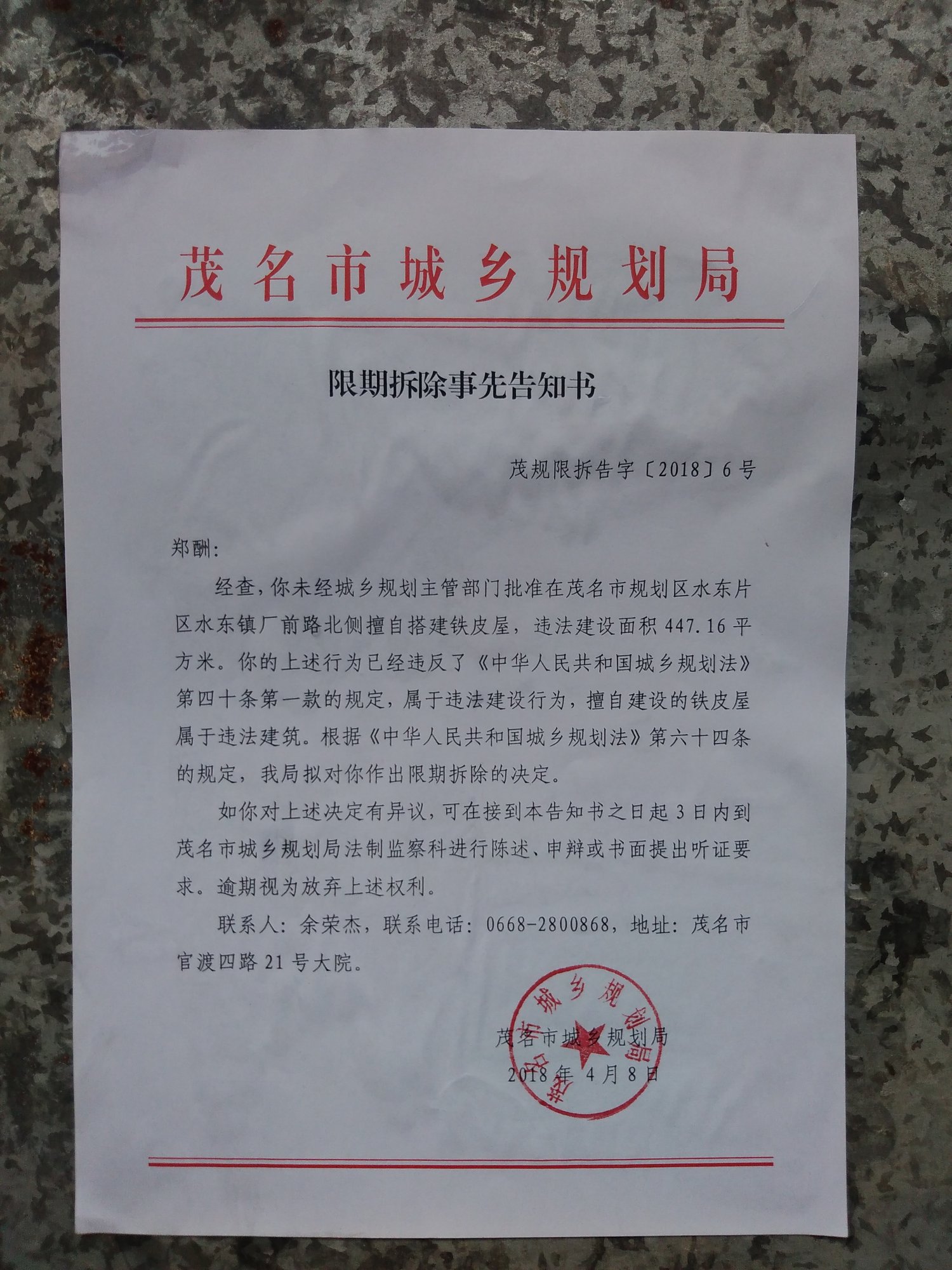茂名市城乡规划局下达限期拆除通知的红头文件,之前村民第二次到区政府静坐抗议时,村委代表们当天也去了茂名市信访局。至于这些部门怎么协调工作无人知晓,推来推去不知道哪里能话事。后来听村民说茂名市领导指责电白区城建部门胡搞瞎搞,事情源于2008年村民去北京上访,后拦截回来作出的协议不符规章。说来也是觉得有点奇葩,区里已经定性非法违建还要搞到市局再来定性一次,这次由茂名市城乡规划局领导亲自下来到厂前路违建现场走一趟,一起陪同他们去粘贴公告,到底是谁在幕后左右阻碍政府拆违工作,搞的停滞不前个个怕事?