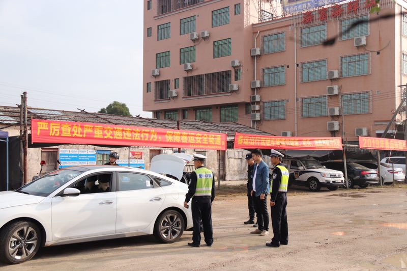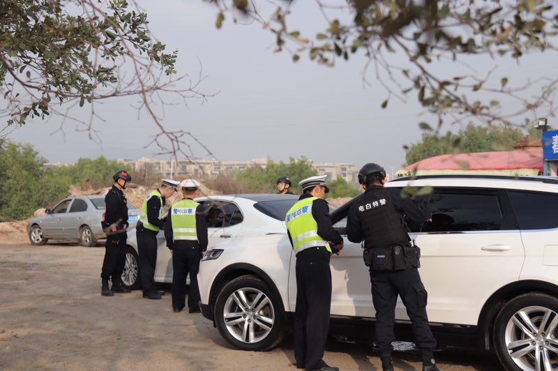 春节期间,电白公安分局交警大队、巡警大队联合在寨头春运执勤点设卡盘查,对经过的车辆进行抽查,重点检查有无搭载违禁品、酒驾等行为。