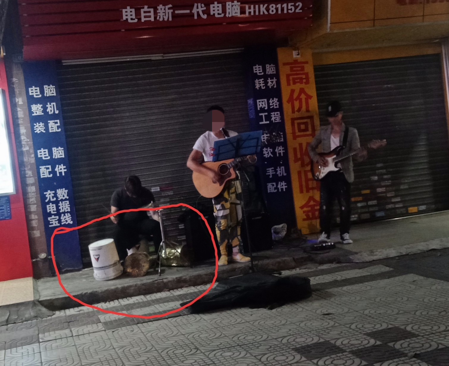 婆市车大炮,有好多途经或听到这声音(也不排除其它趁热闹等因素?),都围过来吸吸,身有带有零钱的都给几块,不过音响配音等不大好,有一亮点,红圈所示,敲、胶桶,敲两个铁桶~,不过个人觉得嘛演唱家驹的歌还行,纯见人见异~见人见智、