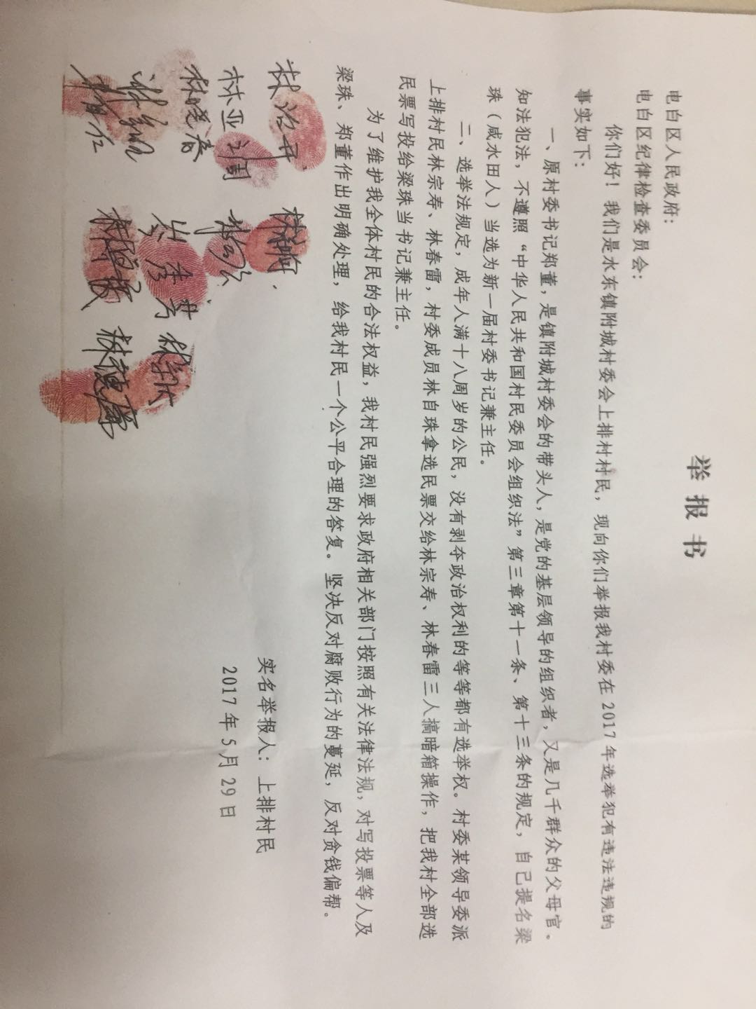 直播现场 小学二年级 注册 2019-03-29 消息 153 反馈评分 18 点数 1 2019-04-22 #17 现公布违纪选举在职人员:梁珠为附城管区书记兼主任,林自珠为附城管区办事员,林宗富为上排村村长且多年违规暗箱当任,既当村长又当出纳现已三届从没有公布村数目,涉嫌贪污违规选举已引全上排村民民愤! 直播现场 说: 证据是全上排村村民,让纪委巡视组下来上排村核查是否发选票到各村民手中选举!附上排村民!举报书 点击展开... 最后编辑: 2019-04-22