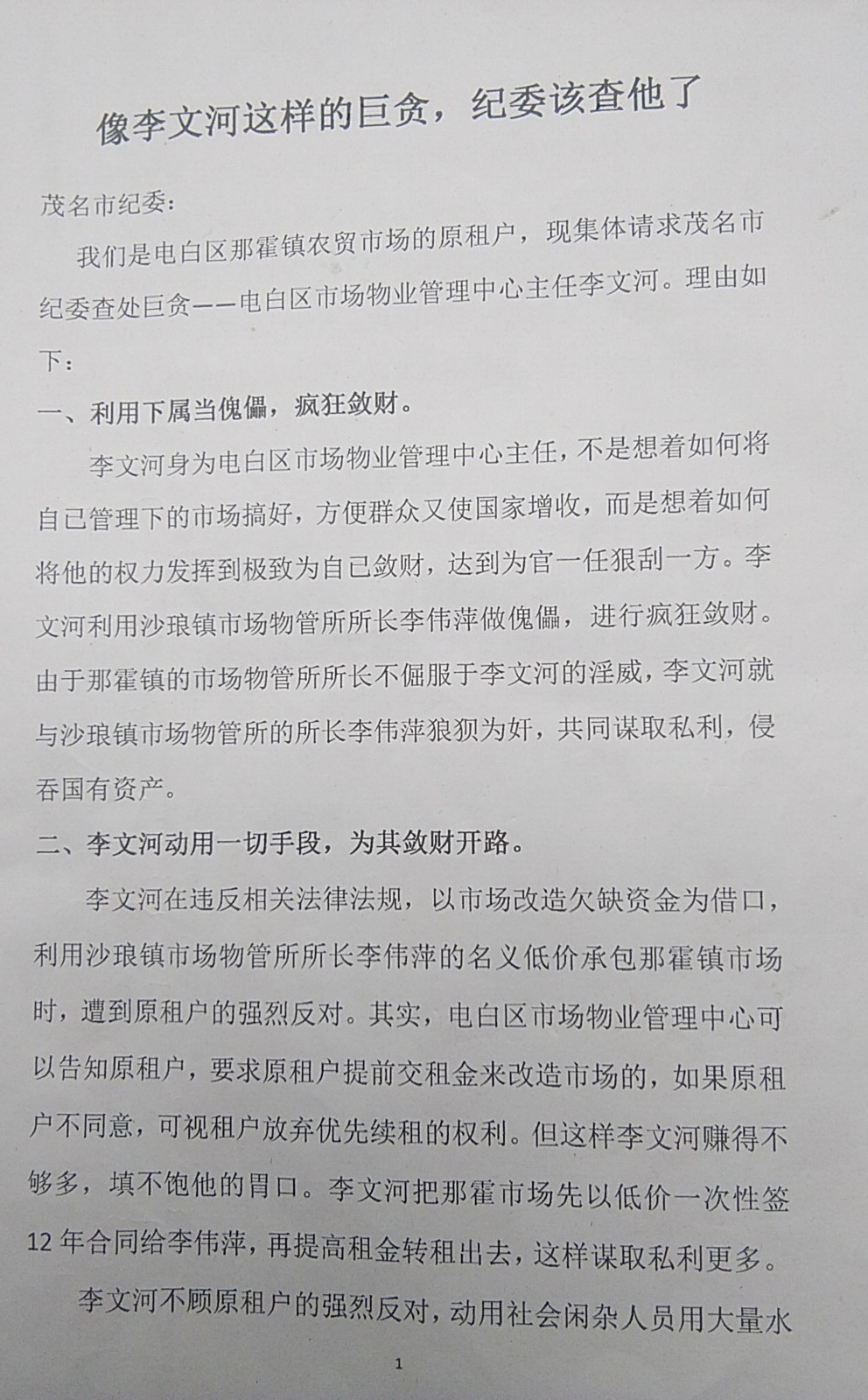 我们是电白区那霍镇农贸市场的原租户,现集体请求茂名市纪委查处巨贪一一电白区市场物业管理中心主任李文河。理由如下: