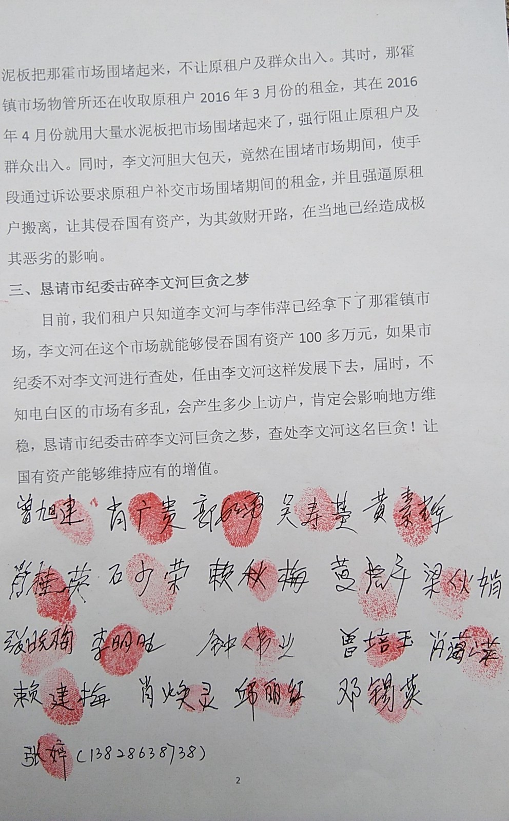 目前,我们租户只知道李文河与李伟萍已经拿下了那霍镇市场,李文河在这个市场就能够侵吞国有资产100多万元,如果市纪委不对李文河进行查处,任由李文河这样发展下去,届时,不知电白区的市场有多乱,会产生多少上访户,肯定会影响地方维稳,恳请市纪委击碎李文河巨贪之梦,査处李文河这名巨贪!让国有资产能够维持应有的增值。