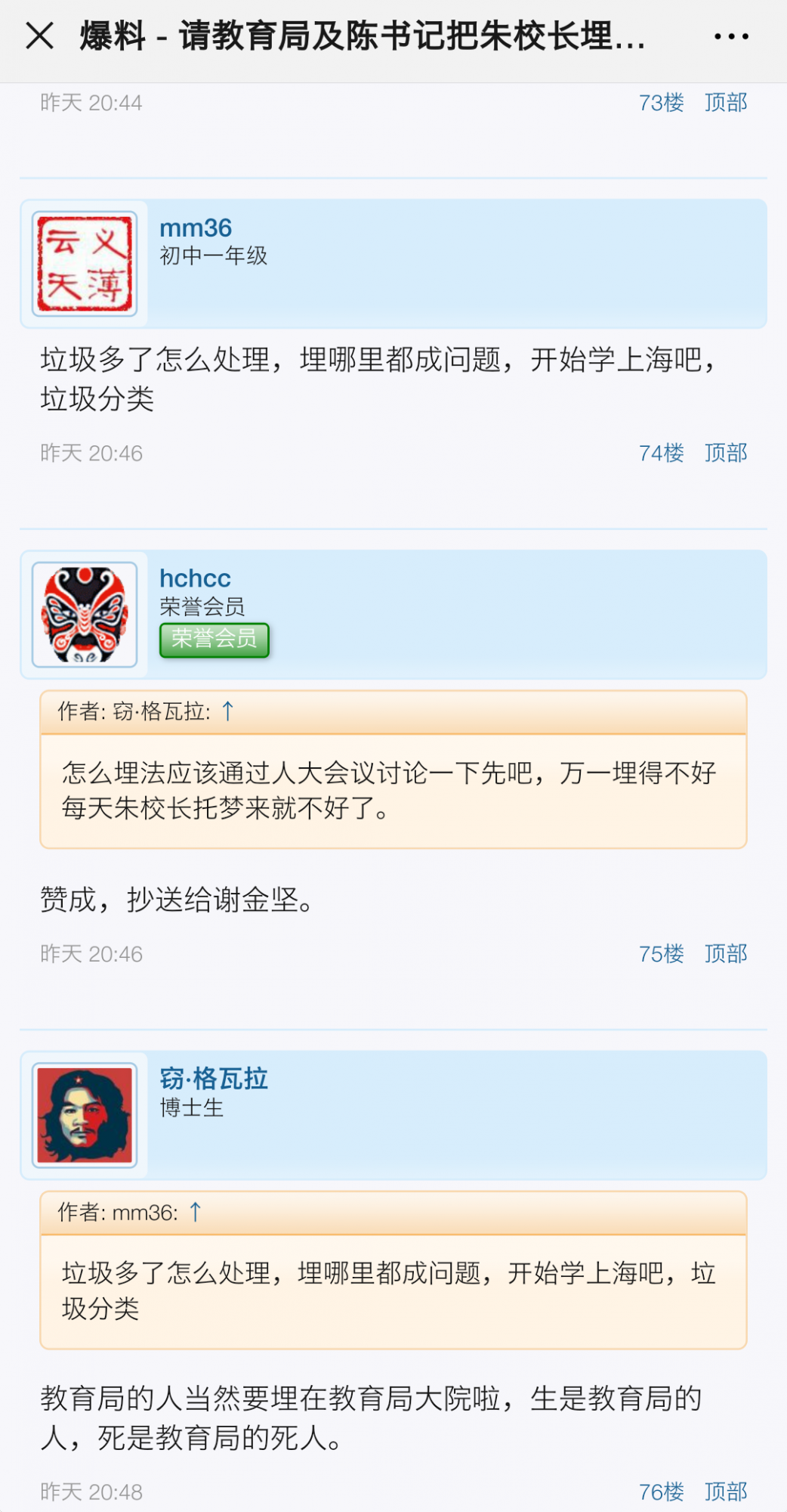 汪洋大盗 初中二年级 注册 2011-04-14 消息 488 反馈评分 91 点数 11 2019-07-13 #171 老坛酸菜 说: 蓝田坡朱校长的帖子在微信中已经看不到链接首页了,后面页数目前没有影响,估计尾页很快就会被某组织强奸。浏览附件331141 浏览附件331142 点击展开... 看来网评员大规模行动了