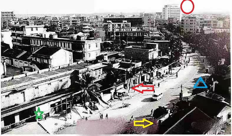 绿色五角星处是电白县五金公司门市部;红圈处是水东湾大酒店;黄箭头是电白汽车站围墙与电白县合作工厂交界处(又名电白县二轻农具厂、锁厂)