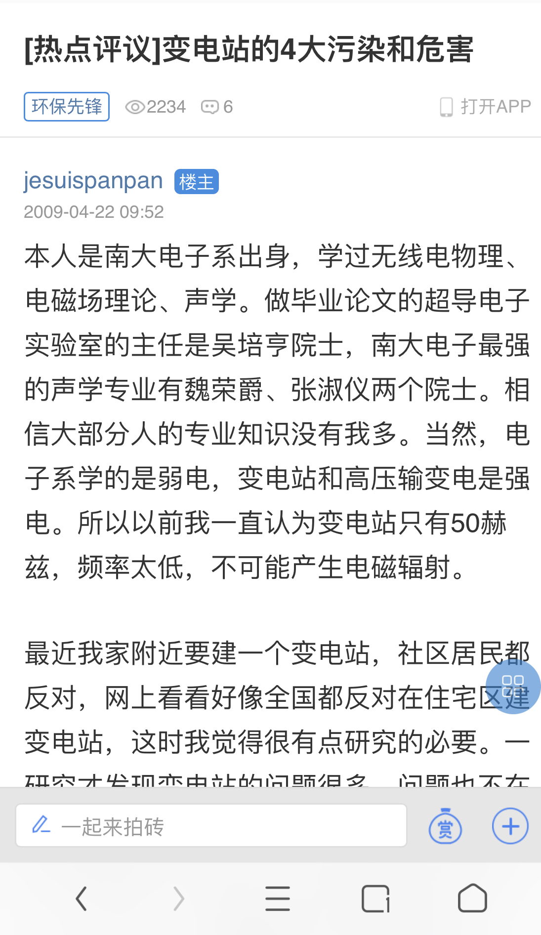 现在论坛说风凉话的人,就是想问一下他们,他本人可能不用到御湖公园、体育馆、一小、妇幼这些地方。但是难道他们父母、小孩、媳妇就不来这些地方了吗?如果他们亲属家人因变电站和线路引起辐射、雷击电被伤害到,到时候他们就会知道今天所说的话可没有后悔药卖了。