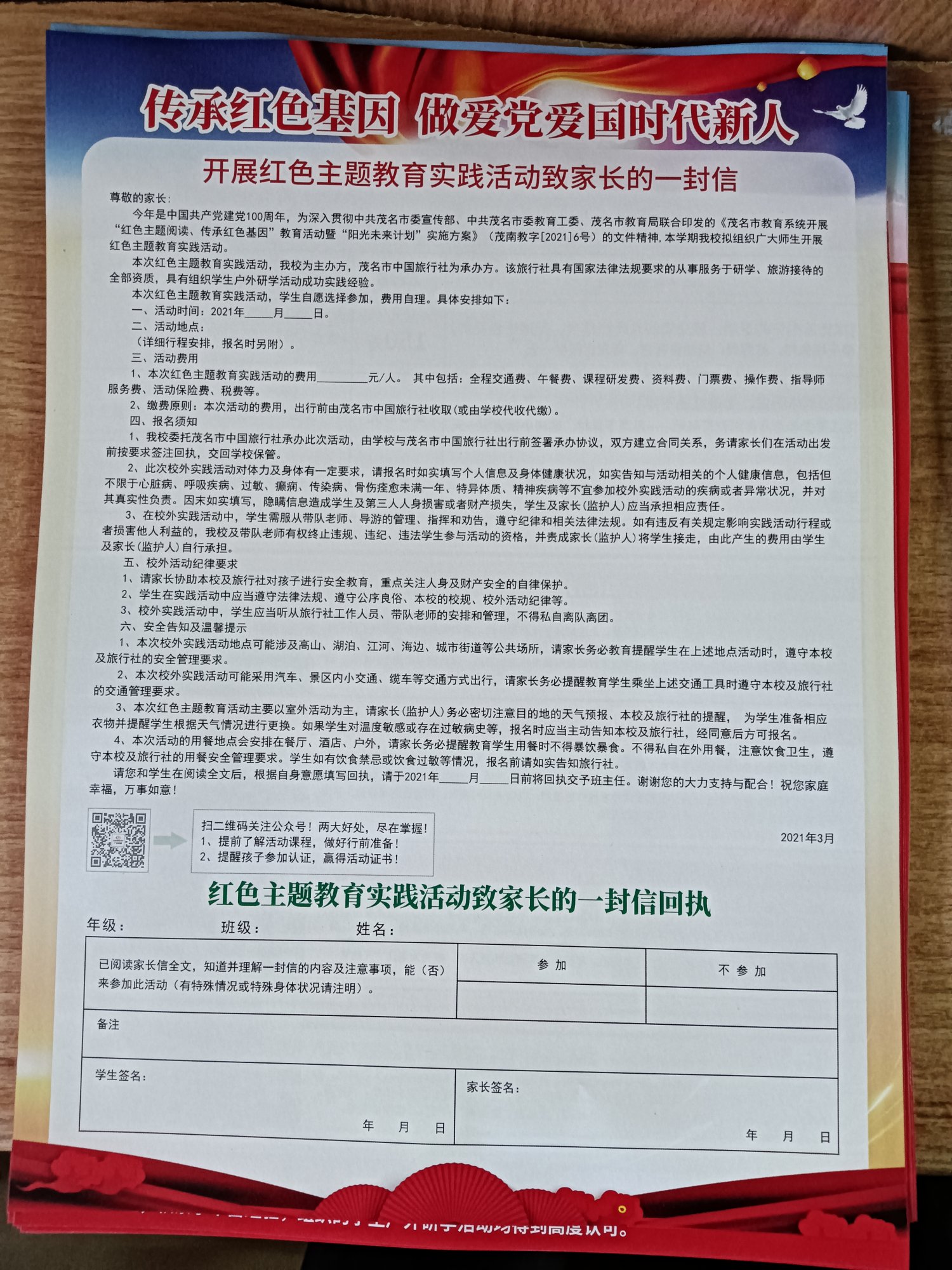 本次活动是班级第一次集体课外实践活动,希望能全体同学参加,这样活动才更有意义,没特殊情况的话尽量参加。报名参加的同学请接龙并填好以下信息表,费用可私发给我。