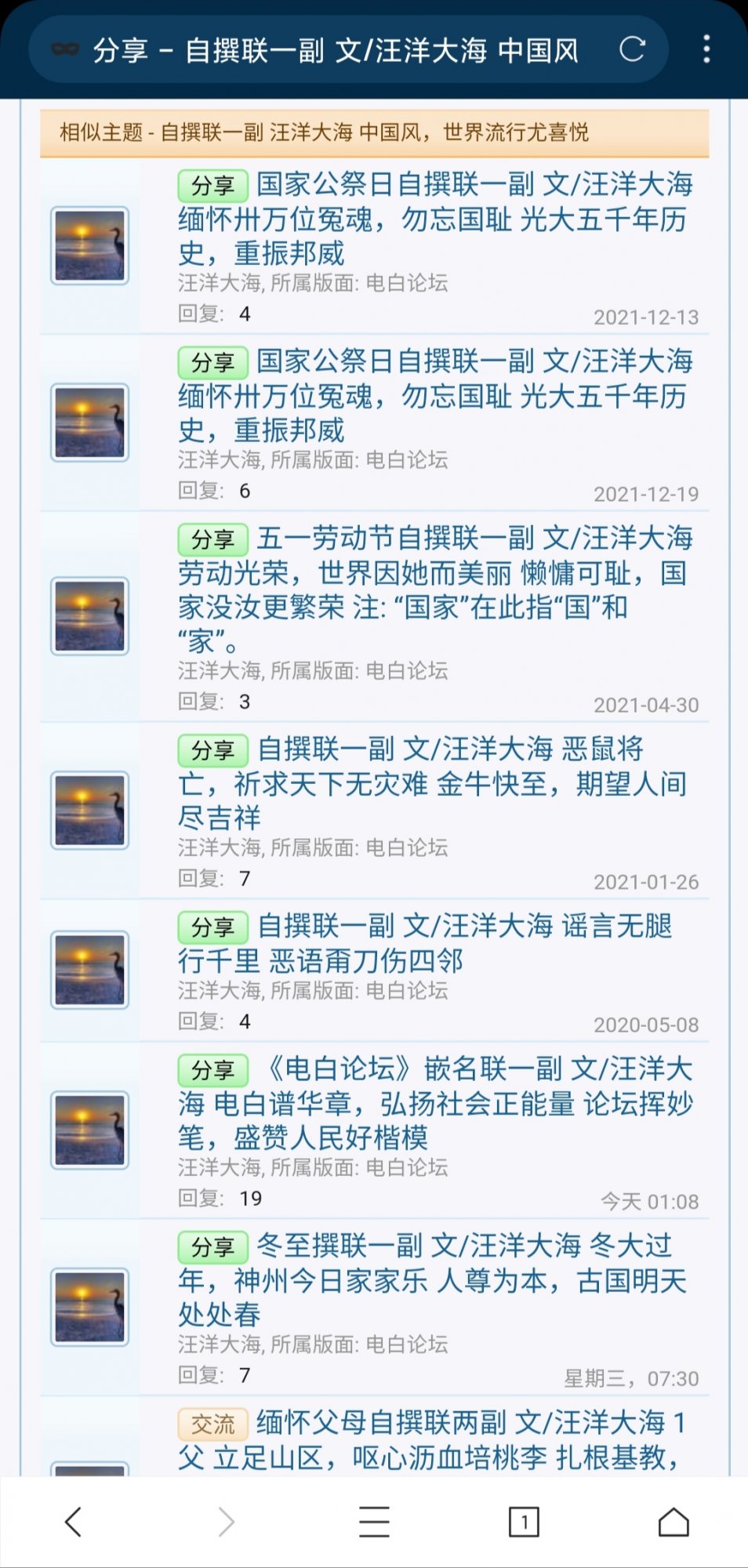 汪洋大海 说: 自撰联一副 文/汪洋大海 中国风,世界流行尤喜悦 洋人节,青年崇媚甚悲摧 点击展开... 汪洋大海 说: 五绝·感恩节感赋 文/汪洋大海 为人懂感恩, 幸福溯根源。 滴水当泉报, 千秋是美言。 点击展开... 汪老真是人老多忘事啊! 请问您过得诗兴大发的感恩节是咋回事? 晚辈劝您一句,政治话题这水很浑,不是您老能看得清的,就别凑这个热闹了,免得瞎摸弄一身脏样有失风范啊!