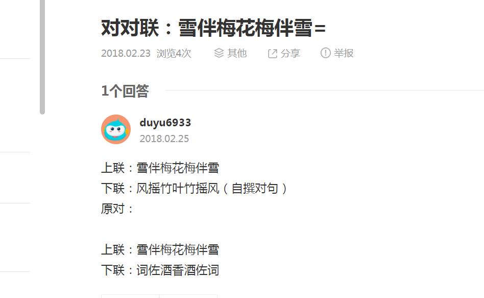 对对联:雪伴梅花梅伴雪=