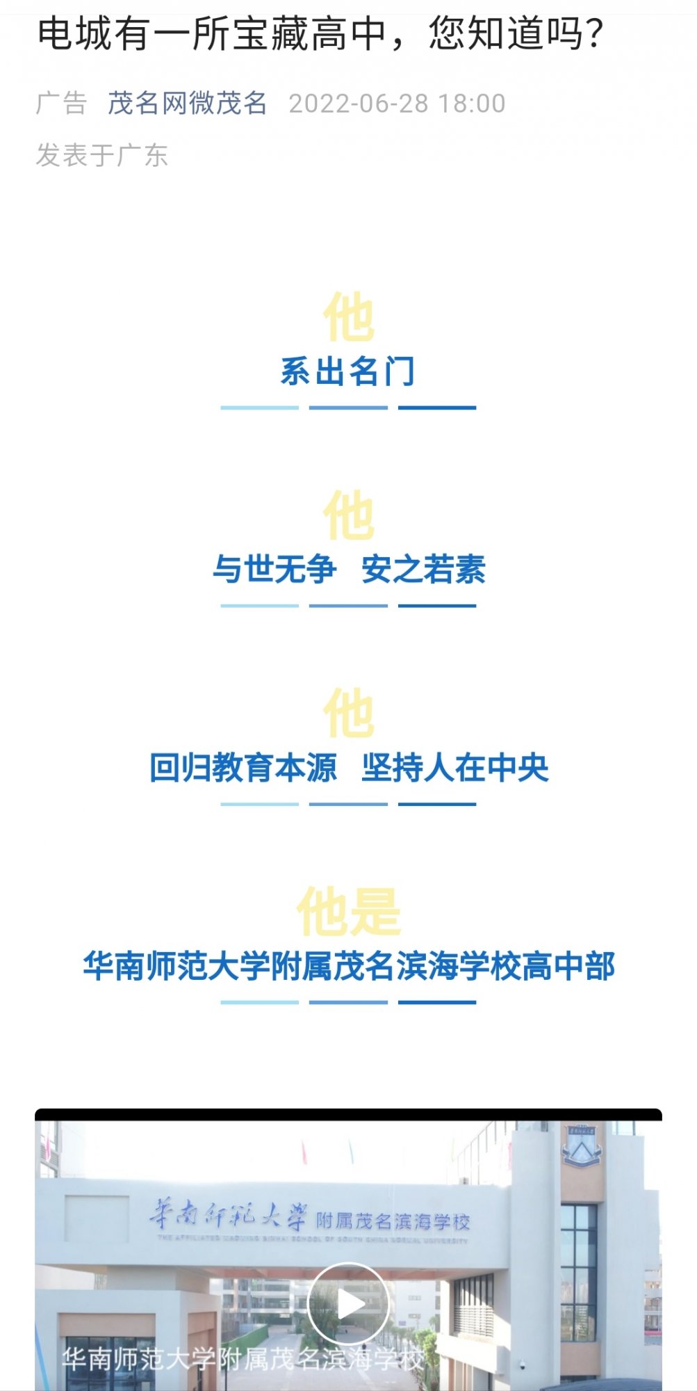 老坛酸菜 荣誉会员 荣誉会员 注册 2017-07-28 消息 2,858 反馈评分 492 点数 191 2022-06-28 #1 华南师范大学附属茂名滨海学校(简称“茂名滨海华附”)是由广东茂名滨海新区管理委员会、华南师范大学与茂名明慧文化发展有限公司合作创办的一所含小学、初中、高中十二年一贯制的高端民办学校。